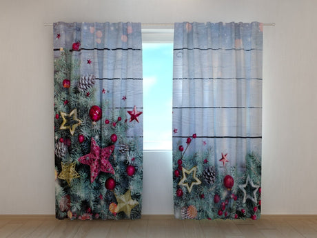 Fotogardine Weihnachtsdekoration aus Tannenzweigen und Sternen