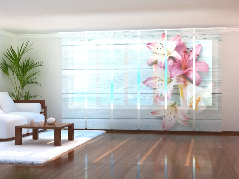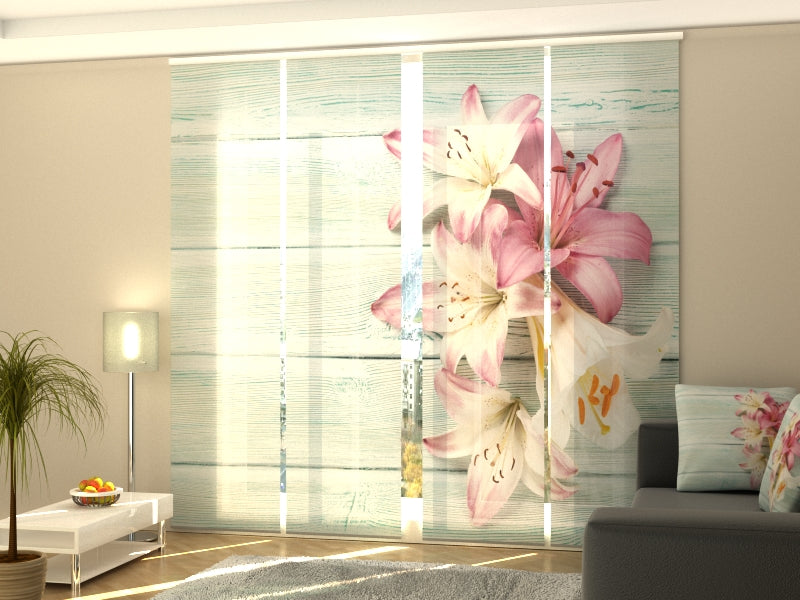 Schiebegardinen Bunte Lilien auf Holz