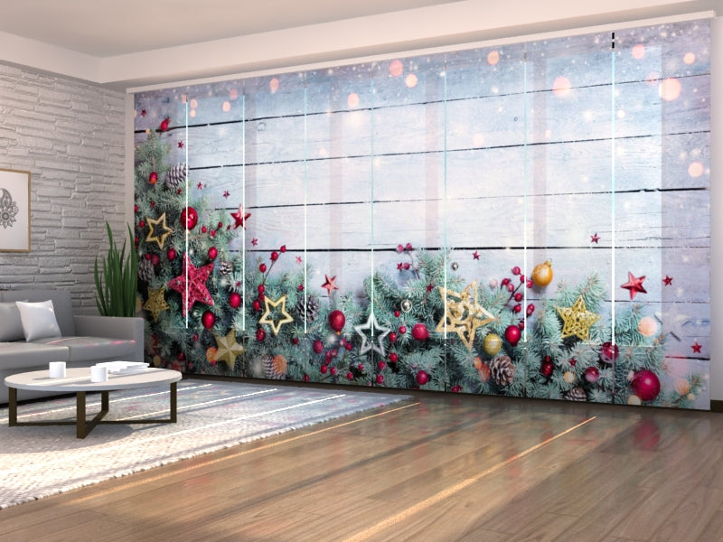 Schiebegardinen Weihnachtsdekoration aus Tannenzweigen und Sternen